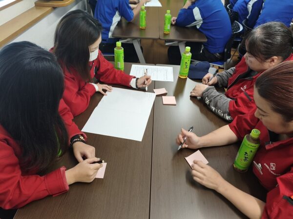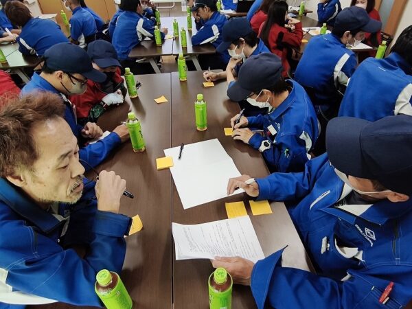 講義の後では、弊社における計画に対する障害である不良について、各部署でどのような種類の不良が起こり、対策をしているか話し合うグループワークも行いました。部署ごとに分かれた各グループで具体的な内容(仕上げならば削りすぎ、プレス場ならば曲げ方向のミス)等が上がりましたが対策としてはやはり単純な見間違いや思い込みが多く、ダブルチェックや確認が早期発見。減少に繋がるというのは共通の見解でした。