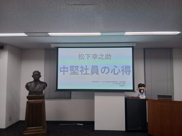午前中は、「経営の神様」と呼ばれる松下幸之助氏の生誕から晩年までの歩みを、講師の方の解説と映像を通して学びました。事業の歴史だけでなく、経営に対する想い、そして“人を生かす経営”という理念に深く触れることができました。
