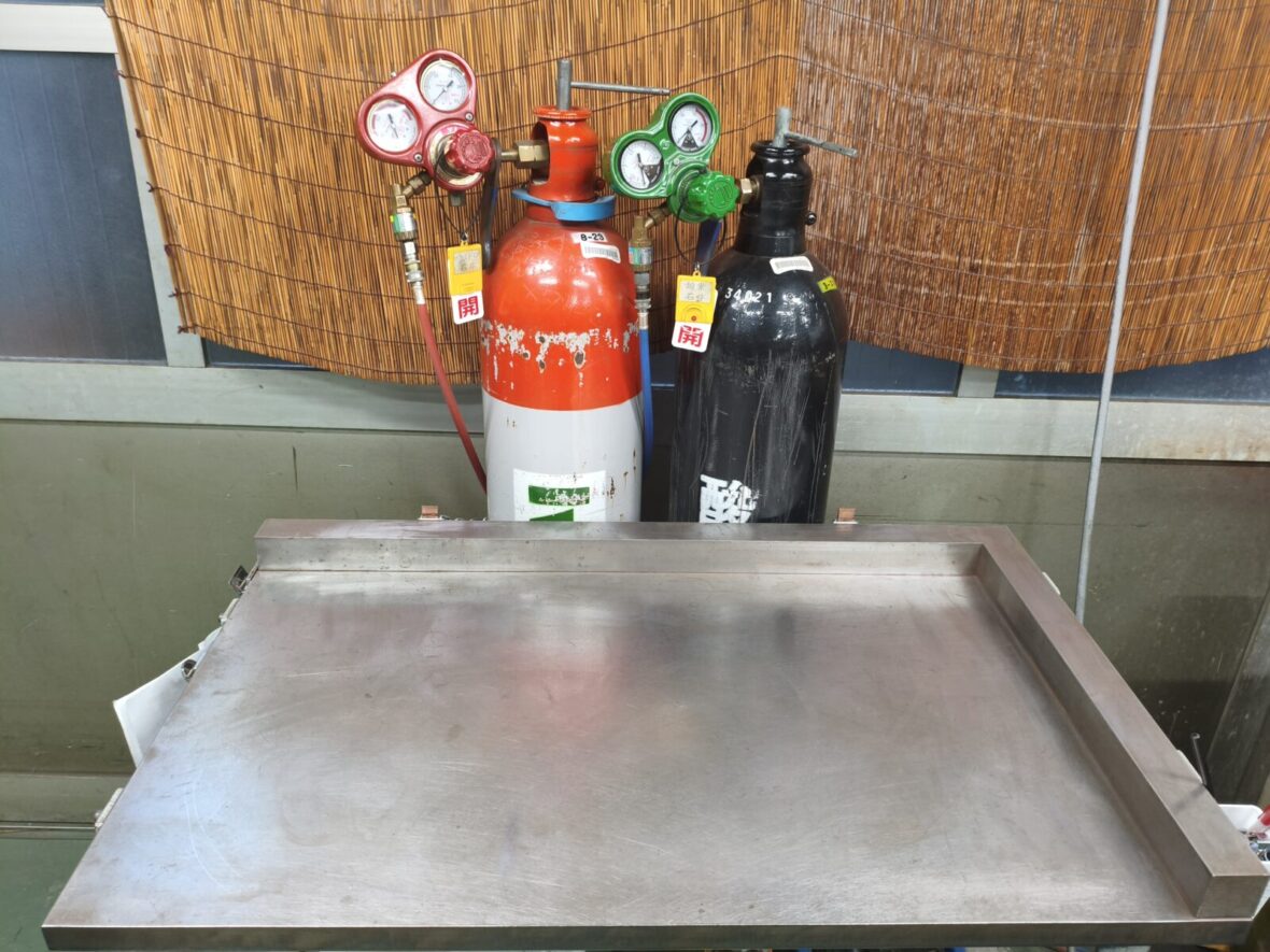 そこで、近くにありながらあまり活用されていなかった棚を清掃し、ガスボンベを安全に置けるスペースへと改造しました。設置場所を見直すことで、入れ替え作業がスムーズになり、定盤前のスペースも広がりました。実際に変更したばかりではありますが、作業者からは「交換がしやすくなった」「作業スペースに余裕ができて動きやすい」といった声が寄せられています。