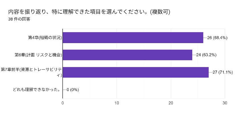 今回アンケートでは全参加者の回答が得られました。ご協力に感謝致します。第6回ISO9001研修は1月5日(月)の予定です。