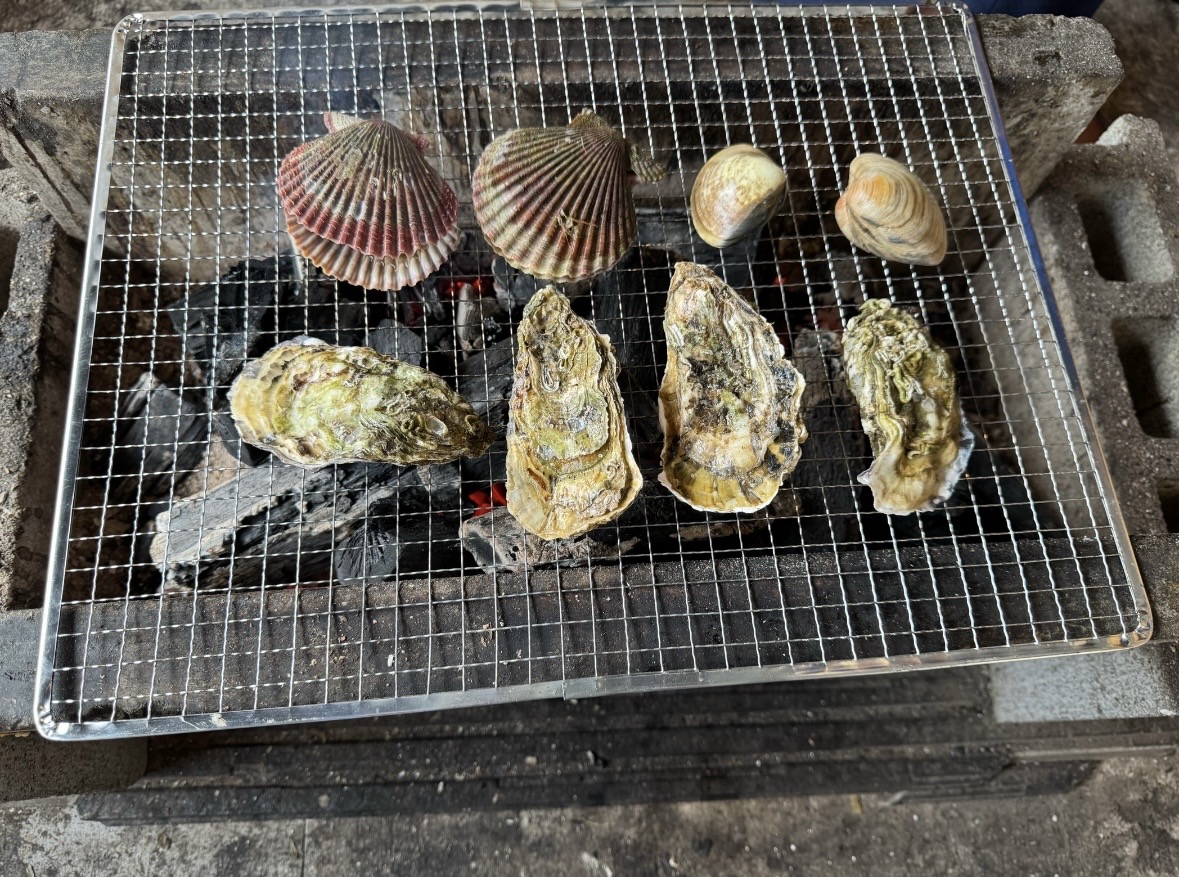 香ばしく焼かれた牡蠣を頬張る。これが本当においしくて自然と笑顔になる。