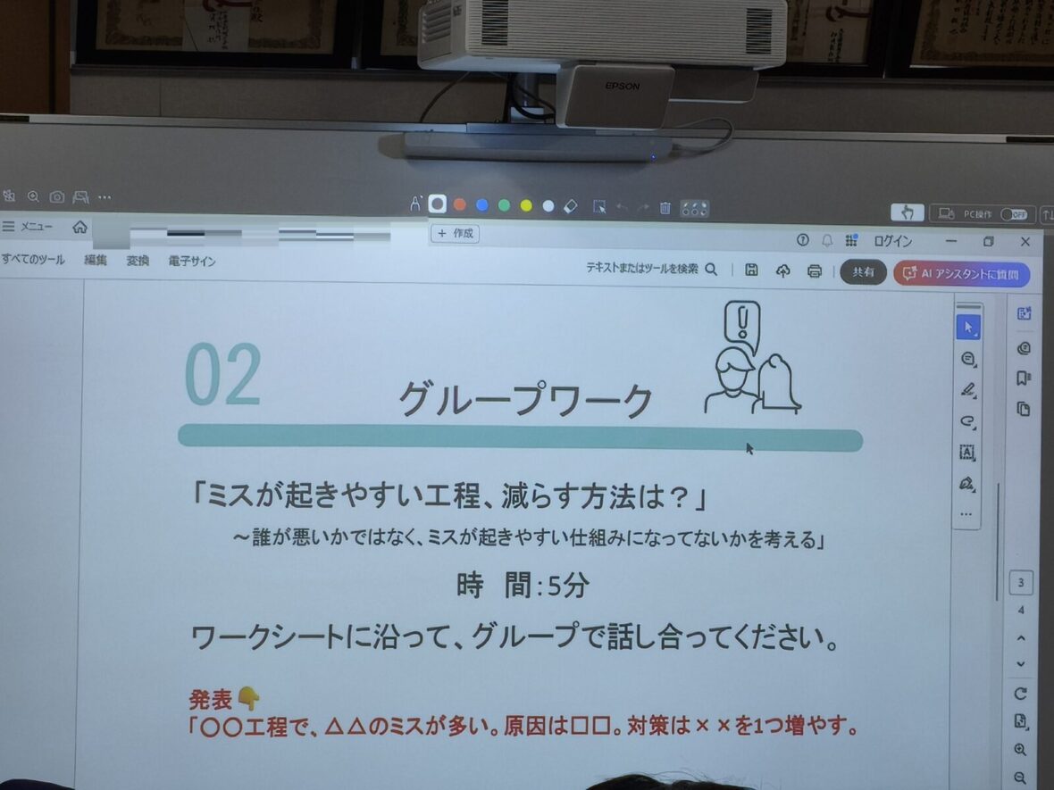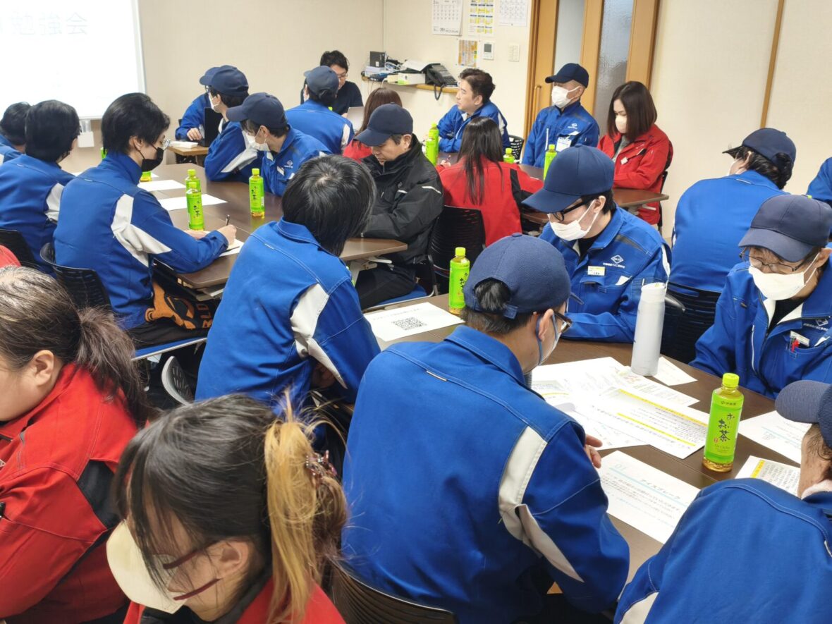 グループワークでは、まずアイスブレイク(研修前に場を和らげる為のコミュニケーション)で一分の自己紹介と一分のフィードバックを行いました。そしてミスが起きやすい工程とその原因、そして減らす為の対策を各自グループで話し合い発表しました。各グループが工程毎に分かれて話し合いましたが、特に製造チームからは直近の社内不良から図面データ作成の徹底を対策として挙げておりました。これらのフィードバックを元に、紡織機器バネ工業株式会社では社内、客先不良が発生しない製造体制を整える取り組みを行っています。